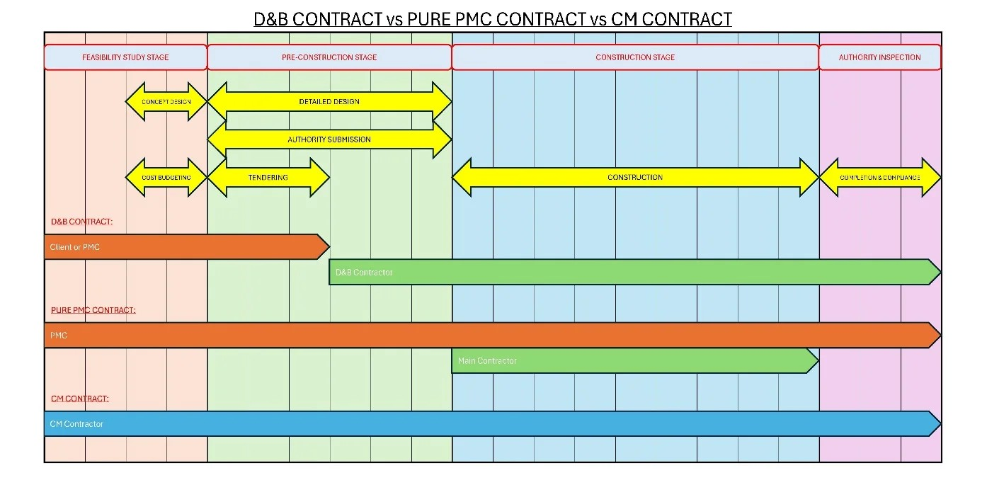 建設契約の主な形態:設計施工(D&B)契約、建設コンサルタント(PMC)契約、建設管理(CM)契約の違い